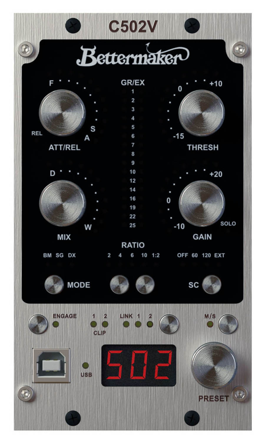 In “BM mode,” the Bettermaker C502V provides gentle mastering-grade compression with unique attack behavior suitable for strapping across drum and mix busses. In “SG mode,” the parameter controls and sound draw inspiration from the classic British VCA buss compressors. And in “DX mode,” the parameter controls and sound draw inspiration from the classic 160A that is so loved on drums. Like all Bettermaker products, the C502V can be fully automated and recalled from a DAW-hosted plug-in in all the popular formats. For stand-alone operation, it offers 399 onboard presets and a unique ‘Undo’ function. Both channels provide wet/dry control and threshold controls that range to 1:2 for expansion and transient designing. When multiple C502Vs are installed in the same 500-series chassis, they will automatically link without any extra cabling.